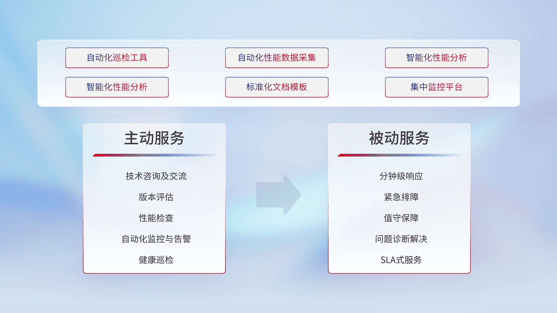智能化工具和标准化文档,,,保障服务质量,,提供主动服务(包含技术咨询、、、版本评估、、、性能检查、、自动化监控与告警、、、健康巡检)和被动服务包含(分钟级响应、、、紧急排障、、、、值守保障、、问题诊断解决、、、SLA服务)。。。。
